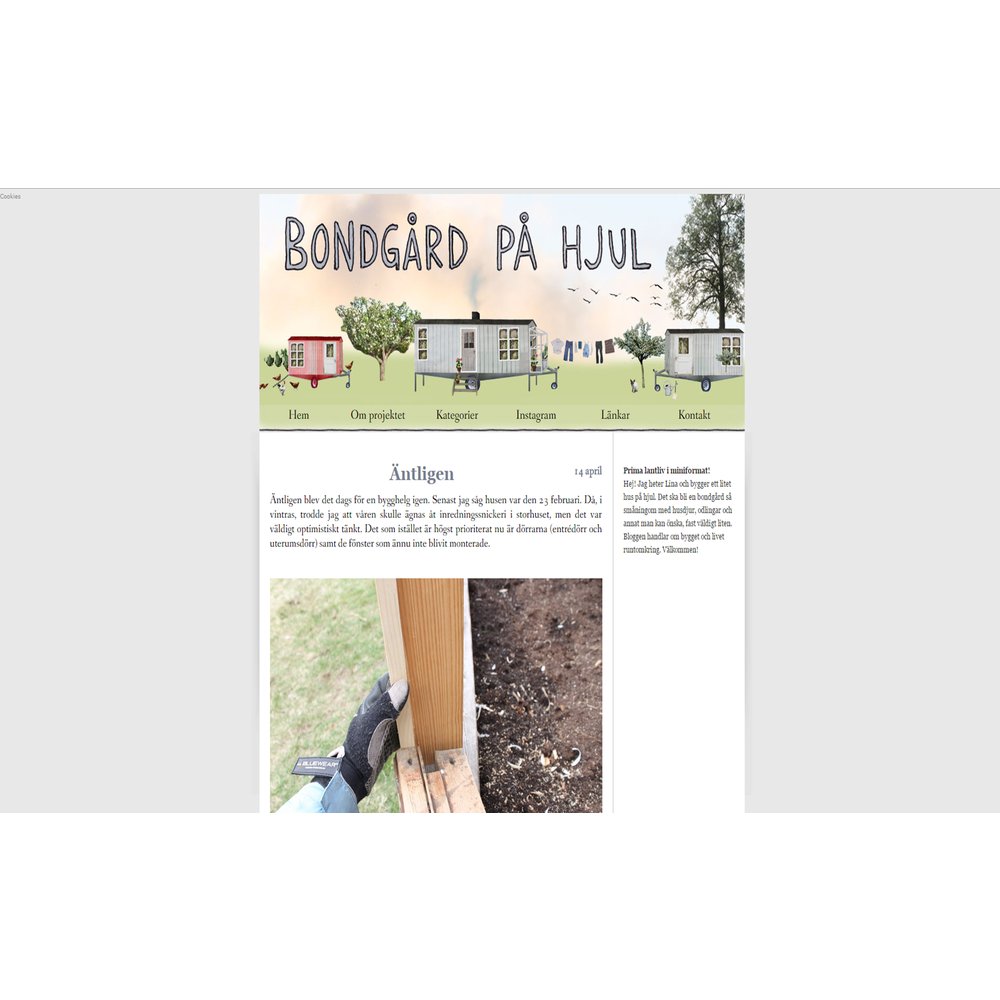 Bondgård på hjul är en blogg som drivs av Lina och som är i full färd med att förvandla och inreda ett hus på hjul. Huset på hjul ska så småningom bli en liten flyttbar bondgård. Lina skriver entusiastiskt om sitt unika projekt och varvar inslag om bondgårdens ombyggnationer med smarta tips kring självhushållning och compact living. Bondgård på hjul har ett tydligt fokus på ett härligt lantliv där skörd av frukt och grönsaker är en central del av Linas liv liksom smarta lösningar och inspiration till roliga byggprojekt.
