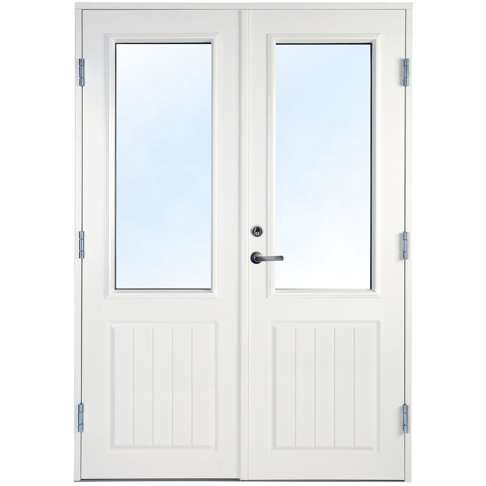 Dörrarna är dekorerade nedtill på både in- och utsida. Fönstrena är en 2-glas isolerrutor med Argon vilket ger ett lågt U-värde.