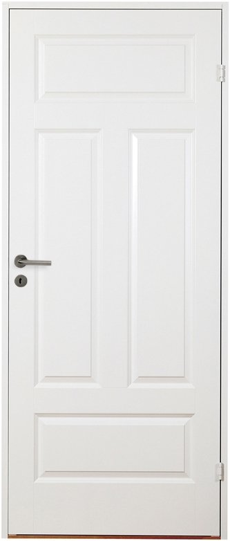 Vitmålad kompakt innerdörr med dekorskiva i en klassisk spegelindelning.
