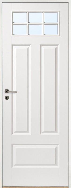 Vitmålad kompakt innerdörr i klassisk spegelindelning för mycket ljusgenomsläpp.