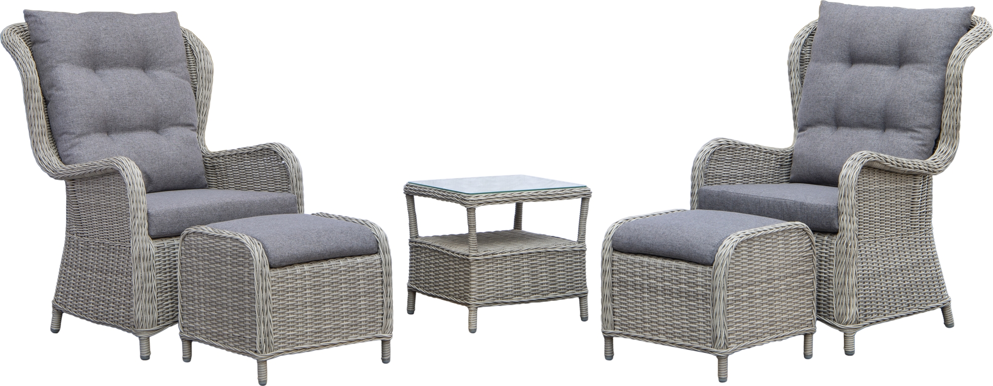 Setet Milano består av två stycken fåtoljer i grå rund konstrottning med tillhörande dynor samt två matchande fotpallar för extra komfort. Det lilla bordet som medföljer i setet blir en perfekt avlastningsplats för drycker och annat som man kan njuta av i sommarsolen. Setet passar likaväl på uteplatsen som i trädgården.