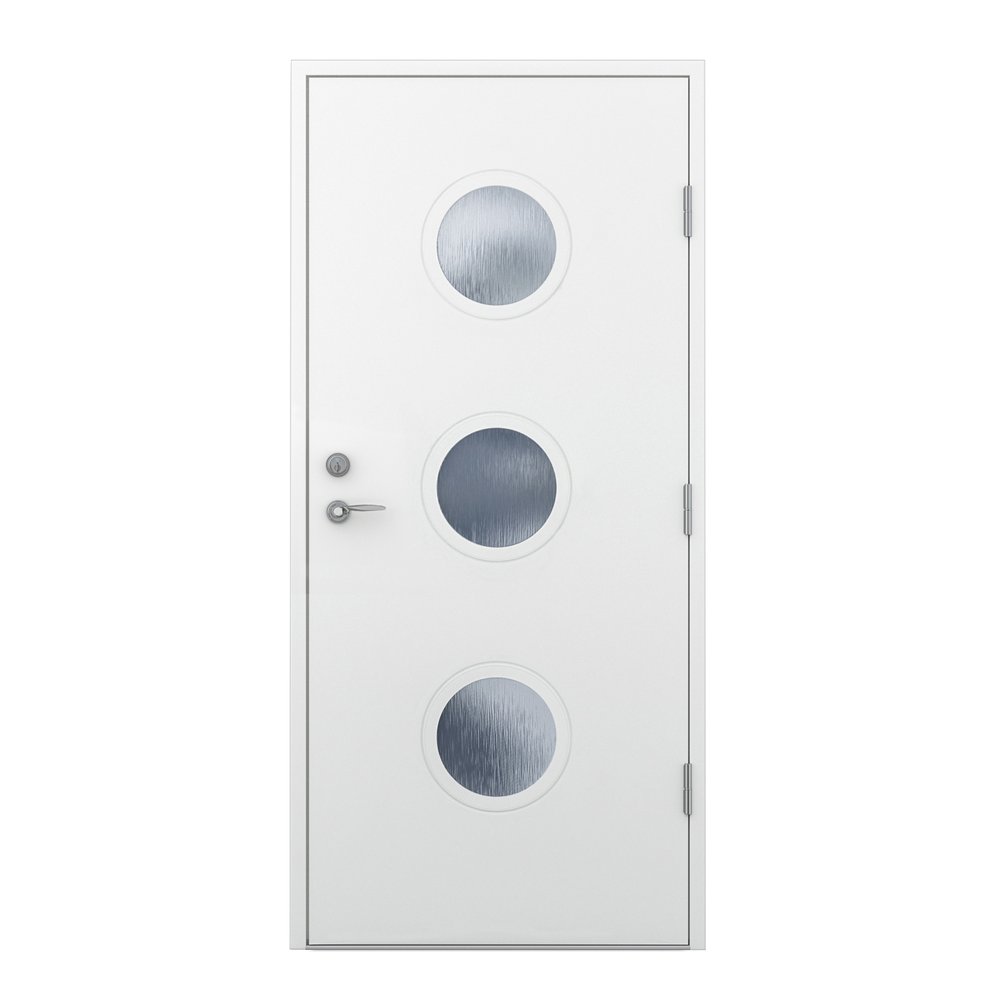 Ytterdörr Clara har en häftig utformning som framhäver sin plats. De tre runda fönsterna har ett härligt ljusinsläpp som bidrar till din inre miljö i hallen, medförande en känsla av kabyss och båtar, men passar himla bra in i den moderna arkitekturen. Dörren finns att få i många olika utföranden för att passa dina behov.